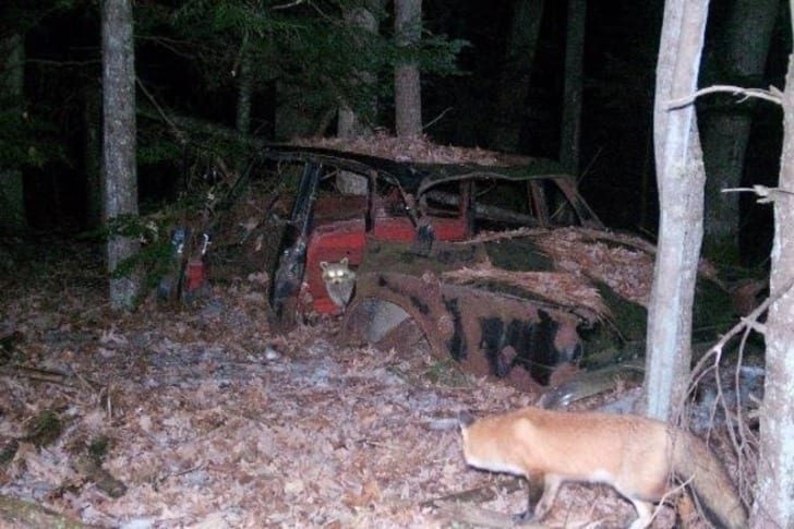 In der Tierwelt ist es sehr wichtig, einen sicheren Schlafplatz für die Nacht zu finden, um vor Feinden geschützt zu sein. Das hat sich wohl auch der Waschbär in diesem Wald gedacht und es sich in einem alten Autowrack gemütlich gemacht. Die Kamera hat dabei genau den Moment festgehalten, als gerade ein Fuchs vorbeikam. Die beiden Tiere scheinen sich direkt in die Augen zu schauen. Wollten sie sich gegenseitig nur gute Nacht wünschen oder wittert der Fuchs hier seine Beute? Der Schlafplatz scheint dann wohl doch nicht so sicher gewesen zu sein, wie der Waschbär angenommen hatte. Hoffentlich ging es für ihn noch gut aus.