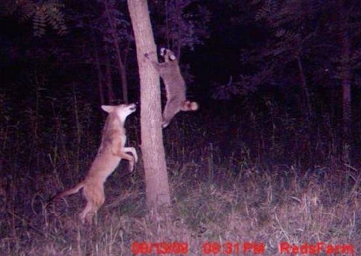 Das sieht nach einer sehr brenzligen Situation für den Waschbären aus. Der Kojote hat sich wahrscheinlich schon auf seine Mahlzeit gefreut, doch der Fluchtinstinkt und das schnelle Handeln hat dem Waschbären das Leben gerettet. Die Wildkamera hat hier genau den Moment festgehalten, als der Waschbär sich auf den Baumstamm vor seinen Angreifer flüchtete und nach oben kletterte. Die Tiere sind hervorragende Kletterer und verstecken sich häufig vor ihren Fressfeinden in den Baumhöhlen. Da kann der Kojote nicht mithalten. Er setzt zwar noch zu einem Sprung an, um nach den Waschbären zu greifen, doch dieses Mal geht er ohne Beute aus.