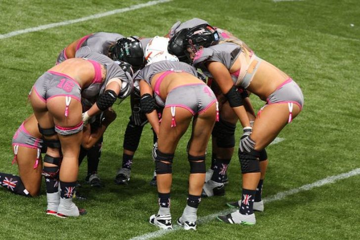 The women in the photo are part of the Lingerie Football League (LFL). With their little intermission, the enthusiastic crowd won’t mind a few more seconds of the next play’s start time if this is the ladies’ counter-game offer. We aren’t sure whether the officials are calling for too many timeouts in this instance, either.