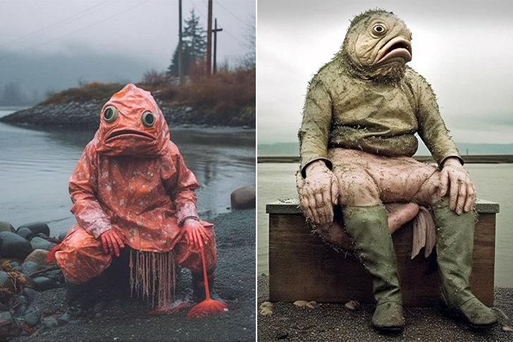 This attempt to generate fishermen led to something that’s more fish than man. It’s a little disappointing but really funny that AI couldn’t get something as simple as a typical rugged angler. Instead, what emerged were bizarre hybrids of human features with aquatic traits. It’s unsettling seeing fish-like heads with human bodies—except in anime of course.