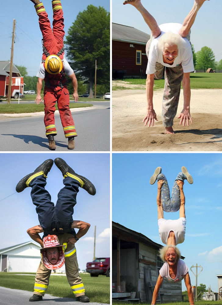 In this bizarre set of images, we witness a mix of elderly folks and firefighters engaged in what can only be described as impossible acrobatics. These figures defy logic, with legs coming out of backs, extra limbs appearing in strange places, and even faces seemingly swapped with legs.
