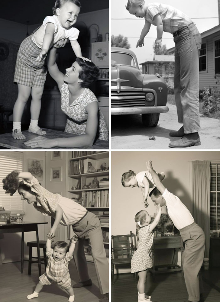 These black-and-white photos aim to evoke a sense of nostalgia, but the AI’s strange interpretations of parent-child interactions turn them into something else entirely. In one image, a mother appears to be playing with a toddler who is far too large for his age, giving the scene an odd, exaggerated feel.