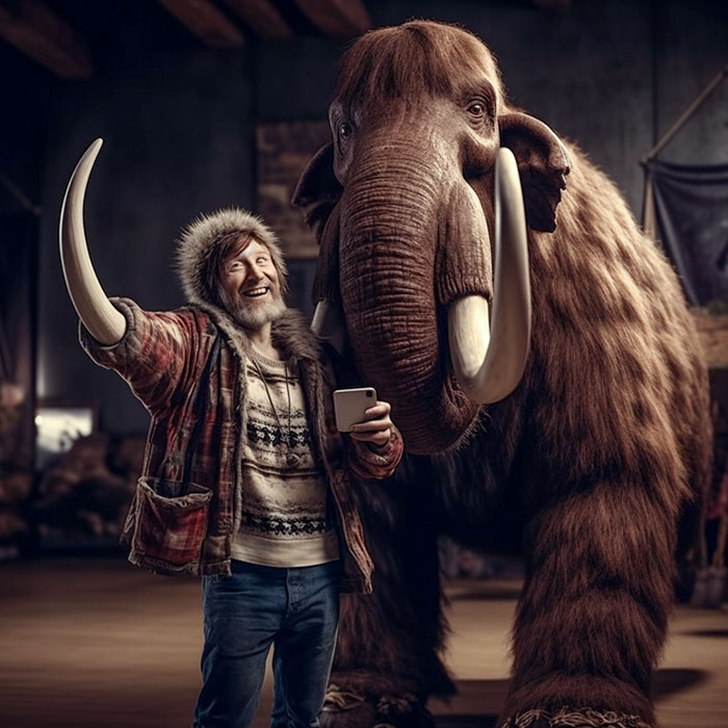 A bearded man dressed for an Arctic expedition casually snaps a selfie with a wooly mammoth in this AI creation. The animal, with its massive tusks and thick fur, seems perfectly content posing for the camera. AI almost got this one without a hitch, but a closer look reveals something strange—the man’s hand is actually a mammoth tusk.