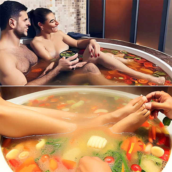 To make things even stranger, the man appears to be holding a bowl of the very soup they’re bathing in. This might leave you wondering if there’s a new kind of self-care involving food-infused water. In reality, spa treatments often use ingredients like herbs and essential oils, but this AI creation took it in a completely different direction.