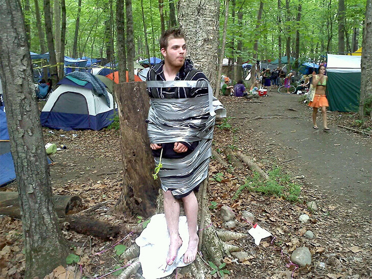 Going camping and spending days and nights in different spots can be very adventurous. It feels like a surprise awaits every morning we wake up. This camper has indeed received his morning surprise, but being tied to a tree with duct tape is not pleasant at all.