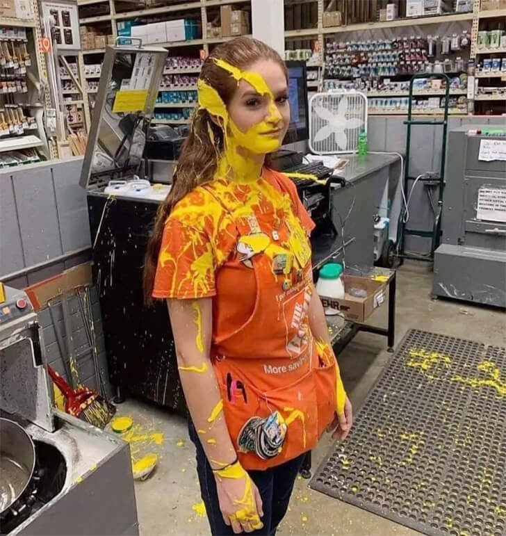 This woman is an abstract art battle survivor! She stands in the middle of the store amid the chaotic sea of yellow paint. Her expression shows a masterclass in the fine art of not giving a hoot anymore. It’s as if the paint can burst and she decided to go full Da Vinci on herself.