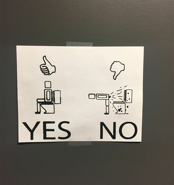 When restroom etiquette gets graphical, you’re in for a treat—or trauma. This sign emerges online, boldly illustrating bathroom dos and don’ts. The pièce de résistance? A man, in a most acrobatic posture, propelling his “business” towards the toilet like an Olympic shot putter.