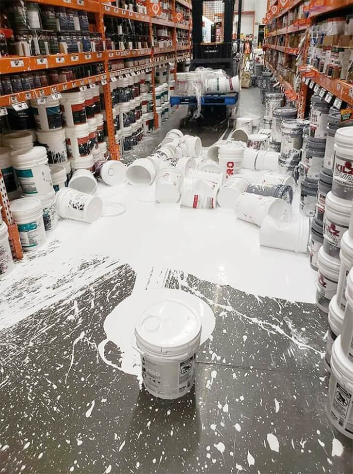 Ah, the pitfalls of manual labor. There you are, carting gallons of paint, thinking it’s just another day at the warehouse. But bam! One wobbly canister sends its comrades crashing down in a cascade of vibrant chaos. Suddenly, the pristine floor is a messy canvas, and your heart sinks. But hey, life’s about perspective, right?