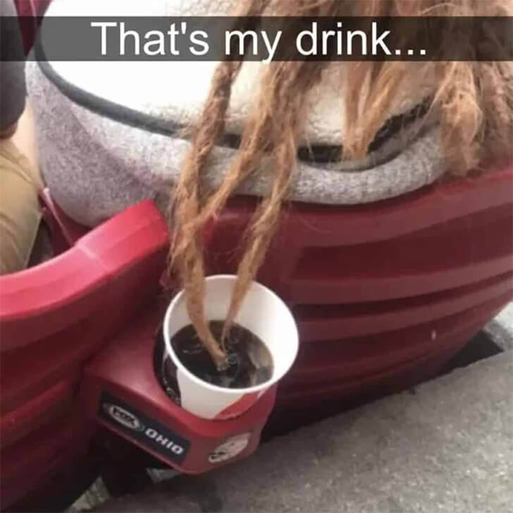 In the excitement of a live sporting event, the only thing frostier than the rivalries are the beverages—or so one fan thought. As this fan settled into his seat, ready for action, he suddenly found himself in a hairy situation—literally! The woman in front of him had leaned back, inadvertently turning her luscious locks into dipping sticks for his precious drink.