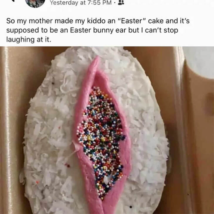 Give some claps to the well-intentioned baker who aimed to craft an innocent Easter bunny ear but ended up with something that could easily be mistaken for a, well, less-than-innocent part of the female anatomy. One glance at the elliptical cake, with its pristine white base, pink layer in the middle, and tasteful sprinkles, reveals why adults are snickering and nudging each other.
