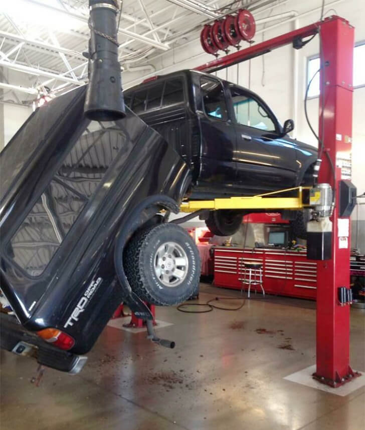 Each day is a new puzzle in heavy machinery and potentially lethal consequences in the glamorous life of a mechanic. Half of this truck is teetering off the platform like a gigantic, wheeled hunk of Swiss cheese. One might ask, “Was skipping Harness 101 in Mechanic School really worth it?”