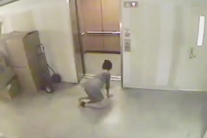 It happened as she stepped out of the elevator. Her shoe heel got stuck in the gap between the wall and the elevator and it lunged her onto the floor. While on the floor, she also had to crawl back quickly to free up her shoe before the elevator doors closed in on it.